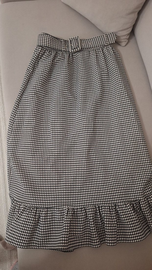 Gri kareli, rahat sentetik kumaştan yapılmış, eteğin ucunda volan detaylı,Paris sokak modası tarzında, günlük kullanıma uygun. hic giyilmedi boyum 158 bileğimin üstüne geliyor bana kısa geldi