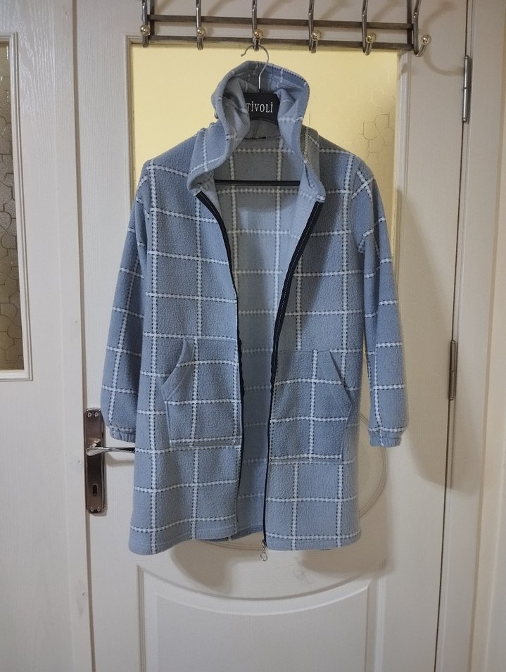 Gri kareli, fermuarlı midi uzunlukta kadın kaban. Uzun kollu, normal kesim ve yakasında çentikli yaka bulunur. Yumuşak ve sıcak kumaştan, günlük rahat kullanım için uygundur. içi polarli kışlık 44 bedene kadar uygun iki kol arası 52 cm boyu 84 cm hiç bir sorunu yok yırtık sökük değildir