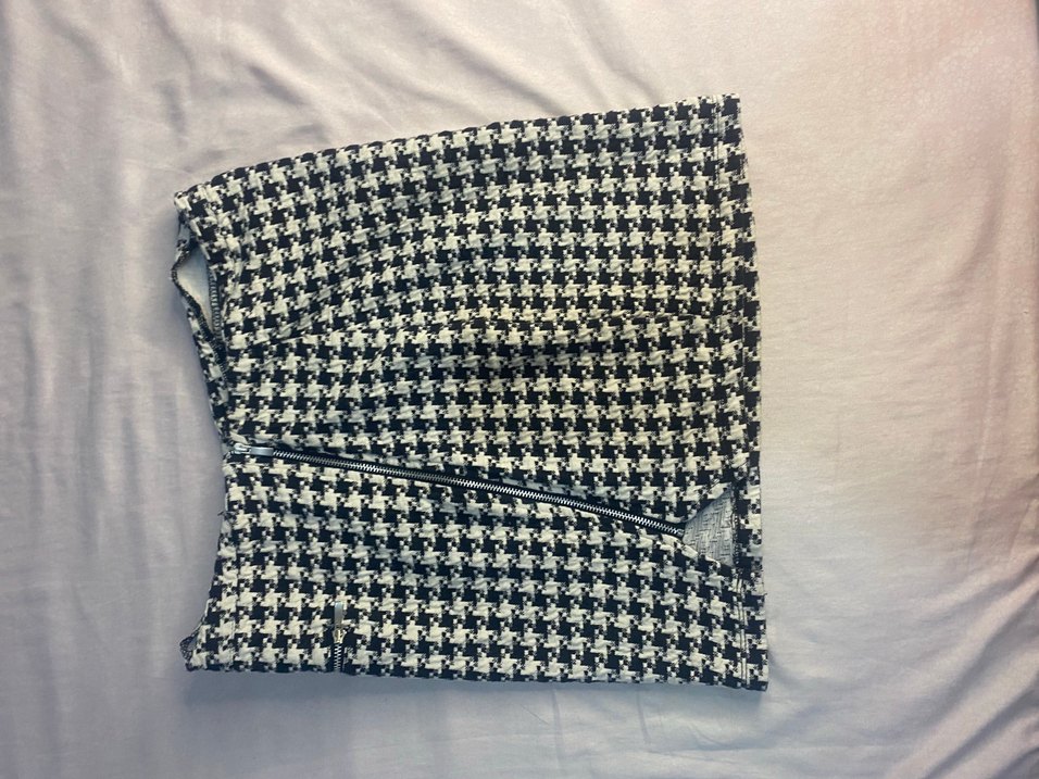 Sentetik kumaştan yapılmış, gri kareli desenli ve fermuarlı, dar kesim midi mini etek.
