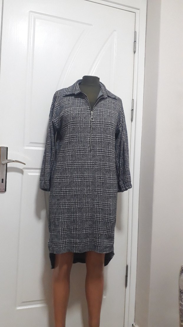 Gri kareli, fermuarlı tunik, bol kesim, yakalı ve uzun kolludur. Sentetik kumaştan yapılmış, midi boyda, rahat sokak tarzı için uygundur.