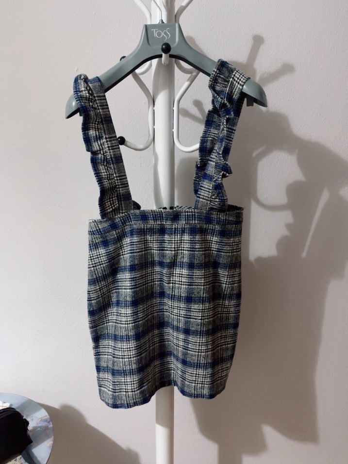 Gri kareli desene ve fırfırlı askılara sahip, yumuşak kumaştan yapılmış etek/elbise