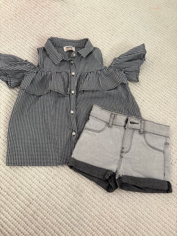 Gri kareli kısa kollu üst, fırfır detaylı ve gri katlamalı paça şortlu bebek kız kıyafet takımı. 4-5 yaş beden