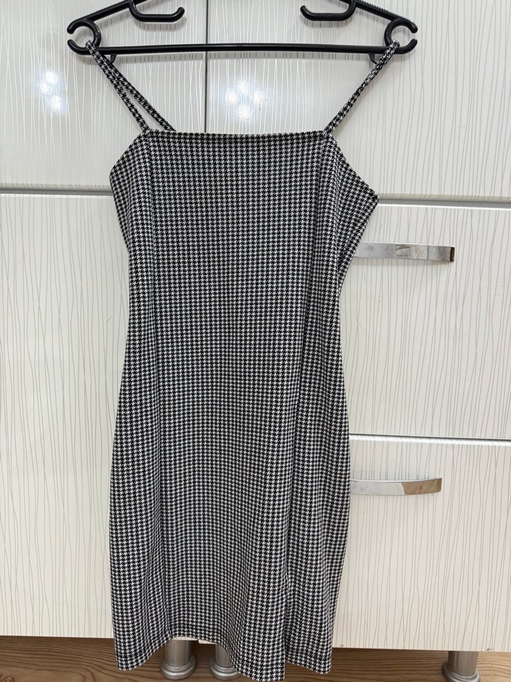 Gri kareli, ince askılı ve tekne yaka mini elbise, yırtmac detaylı Sentetik kumaştan üretilmiş, minimalist sokak stiline uygundur. Bi kere giydim kısa ama aşırı güzel duruyo