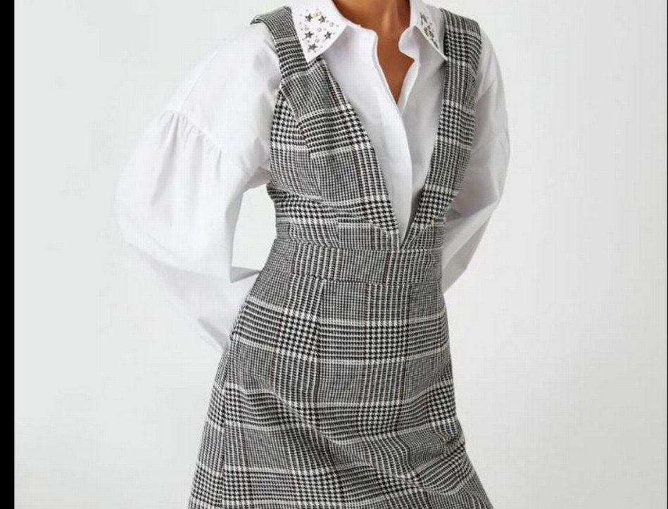 Gri kareli jile elbise, V yaka ve kemerli bel detayına sahiptir. Sentetik kumaştan üretilmiş, askılı kollu ve ofis için uygun, trend sokak stiliyle uyumludur.