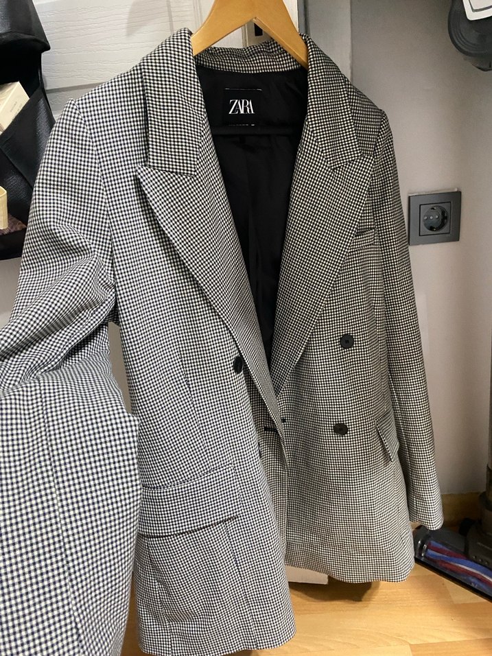 Gri kareli blazer, kesik yakalı ve düğmeli, normal kesim, uzun kollu ve midi boyda, günlük kullanıma uygun.