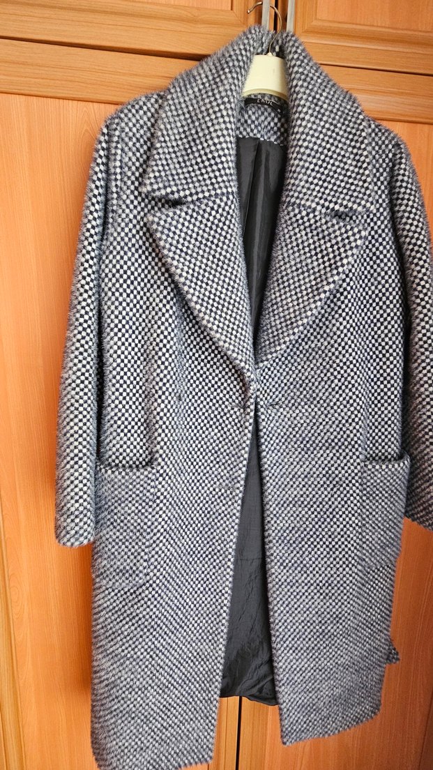 lacivert,beyaz kareli desenli, midi uzunlukta ve çağdaş tarzda kadın kürk, rahat ve şık bir görünüm sağlar. kemerindeki sorunu görselledim.düğmeleri yok tekrar takılabilir onun dışında hiçbir kusuru yoktur.