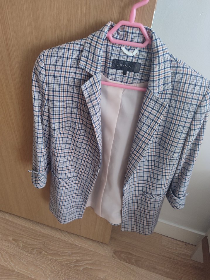 Kadın blazer, çıtçıtlı önü, çıtçıtlı kol detaylı, sentetik kumaştan, regular fit, gri kareli desene sahip, midi boyda, ofis ve günlük kullanıma uygun.