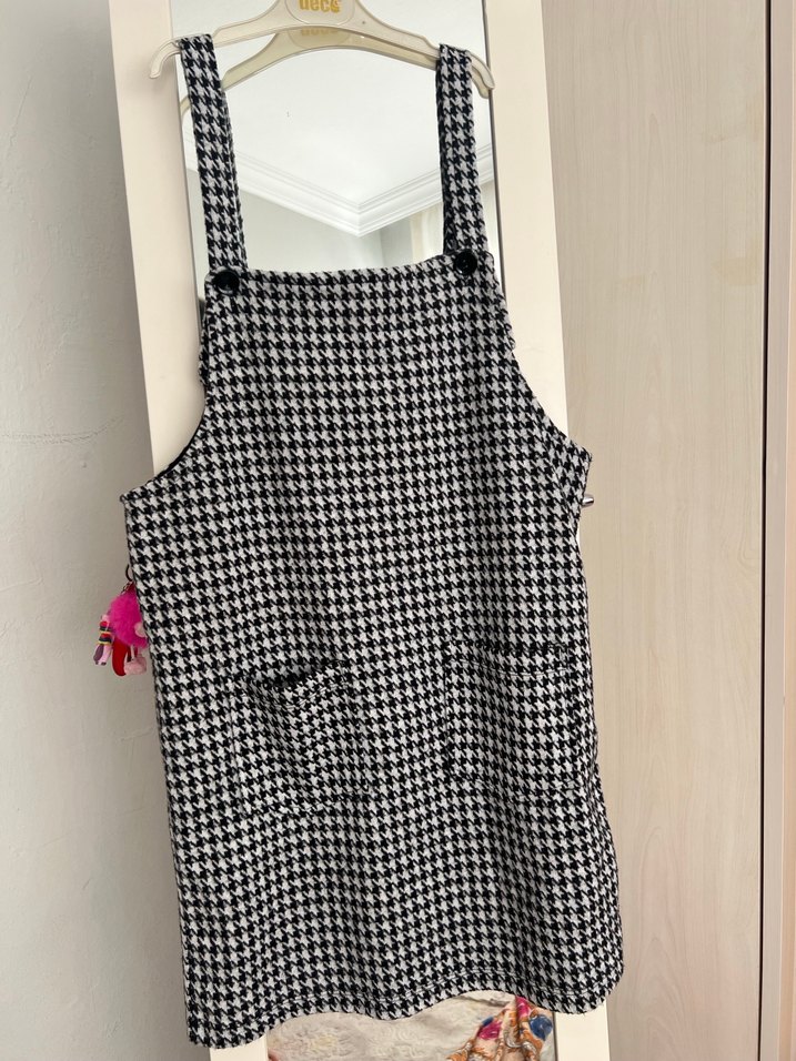 Gri kareli örme kumaştan, askılı, bol kesim kısa tulum. Yüksek yakalı ve midi boy, günlük sokak stiline uygundur.
