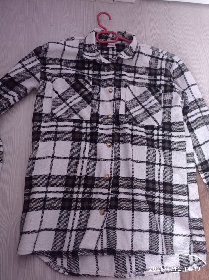 Pamuk kumaştan yapılmış, düğmeli, uzun kollu ve yaka detaylı gri kareli kadın gömleği. Rahat ve bol kesim, günlük sokak stili için uygun.