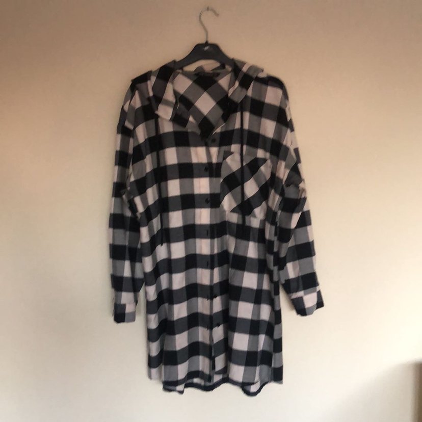 Gri kareli kadın gömlek, oversize kesim ve midi boyda. Uzun kollu, yakalı ve düğmeli, yumuşak sentetik kumaştan rahat bir sokak stili sunar.