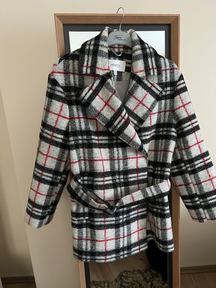 Gri kareli, yün kumaştan yapılmış, kemerli ve normal kesim midi uzunluğunda kadın kabanı. Notched lapel yakaya sahiptir, günlük sokak stili için uygundur.