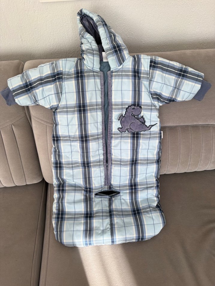 Gri kareli kapüşonlu bebek tulumu, toka detaylı ve yumuşak sıcak kumaştan üretilmiştir. Dinozor işlemeli ve sokak tarzındadır. ❄️
