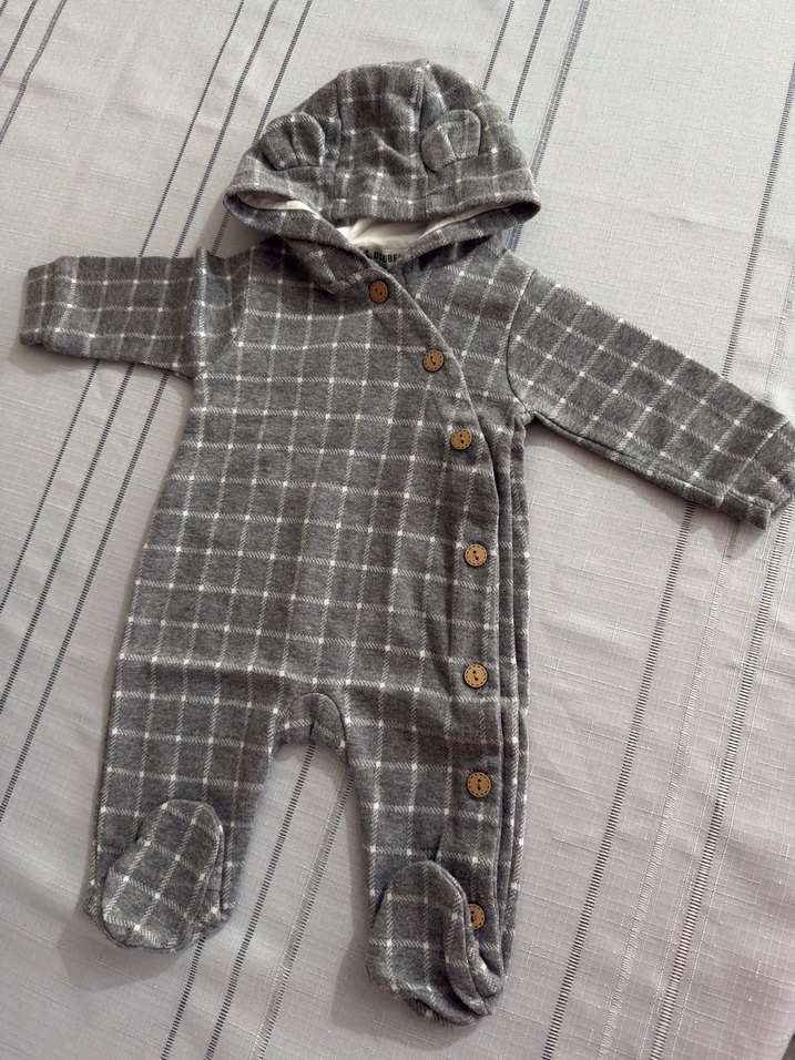 Gri Kareli Kapüşonlu Bebek Tulumu