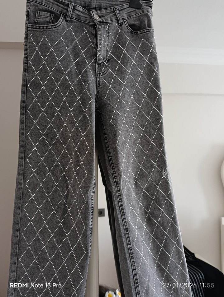 Gri kareli desene ve kemerli bele sahip, normal boy midi uzunluğunda, regular fit kadın denim pantolon. Sokak stiline uygun.tasli harika görünümlu