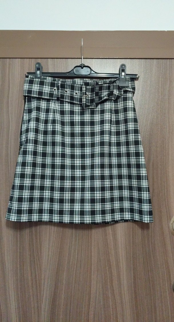 Gri kareli, kemerli mini etek, normal kesim ve sentetik kumaştan günlük rahat kullanım için uygundur.