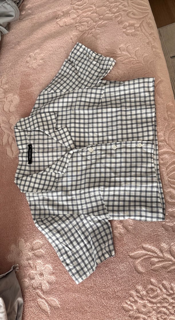 Gri kareli keten kumaştan, kısa kollu ve yakası kesik detaylı, düğmeli, bol kesim gömlek. Rahat ve günlük kullanıma uygun.