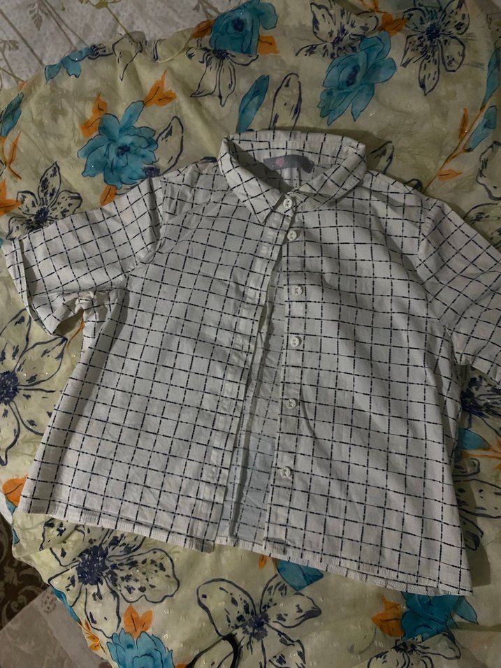 Gri kareli, kısa kollu, düğmeli ön kısmı ve yakalı kadın gömleği. Yumuşak pamuktan üretilmiş, rahat kesimli ve midi boyda, günlük sokak stili için uygun.