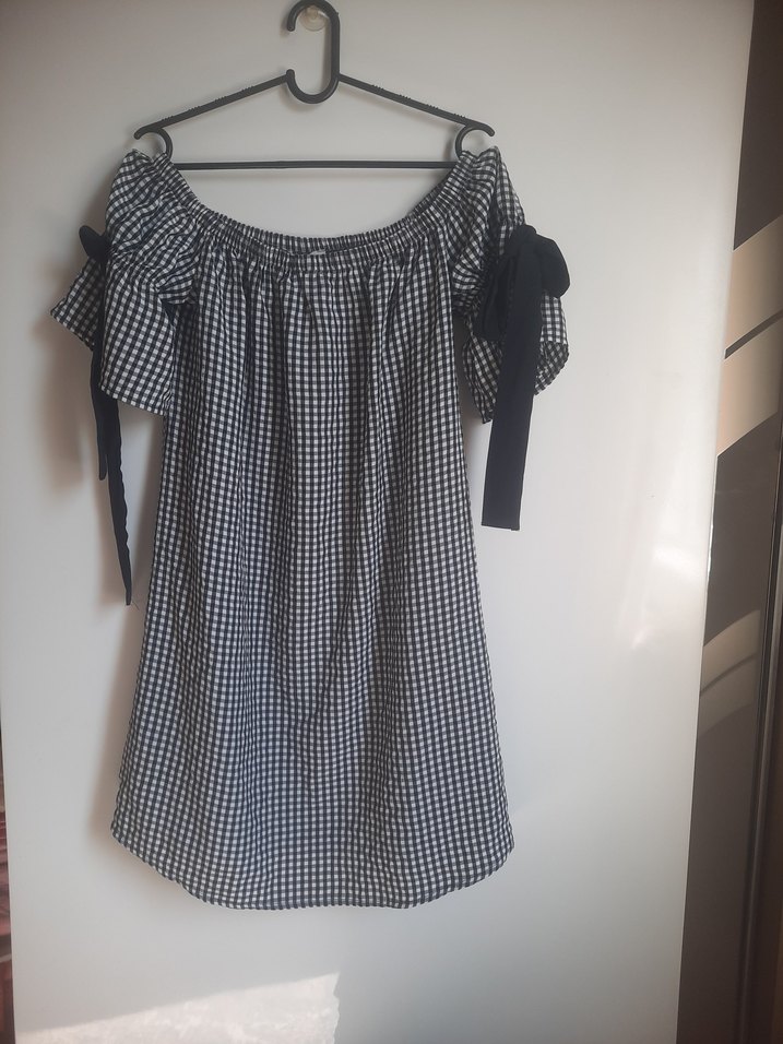 Gri kareli midi elbise, kayık yaka ve fırfırlı askılı kollara sahip. Sentetik kumaştan salaş kesim, günlük kullanım için uygun, trend sokak stiliyle uyumlu.