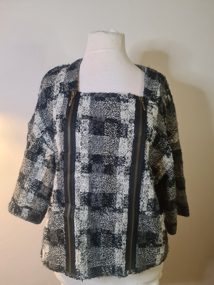 Gri kareli kısa hamile ceketi, bol kesim ve uzun kolludur. Önünde çift fermuar bulunur. Sokak modası ve Paris tarzı etkisi taşır. Günlük kullanım için uygundur.
