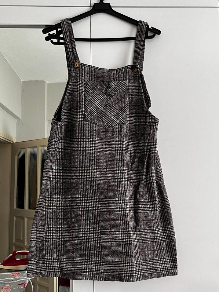 Gri kareli desenli, ayarlanabilir askılı ve ön cepli dayanıklı kumaştan yapılmış mutfak önlüğü.