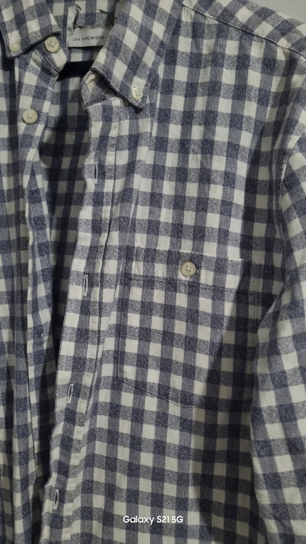 Gri kareli pamuklu erkek gömlek, düğmeli, yakalı ve uzun kolludur. Günlük rahat sokak stili için uygundur.