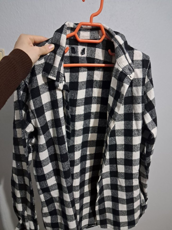 Gri kareli pamuklu gömlek, yakası çentikli ve düğmeli, uzun kollu, bol kesim ve midi boydadır. Günlük rahat stil için uygundur.