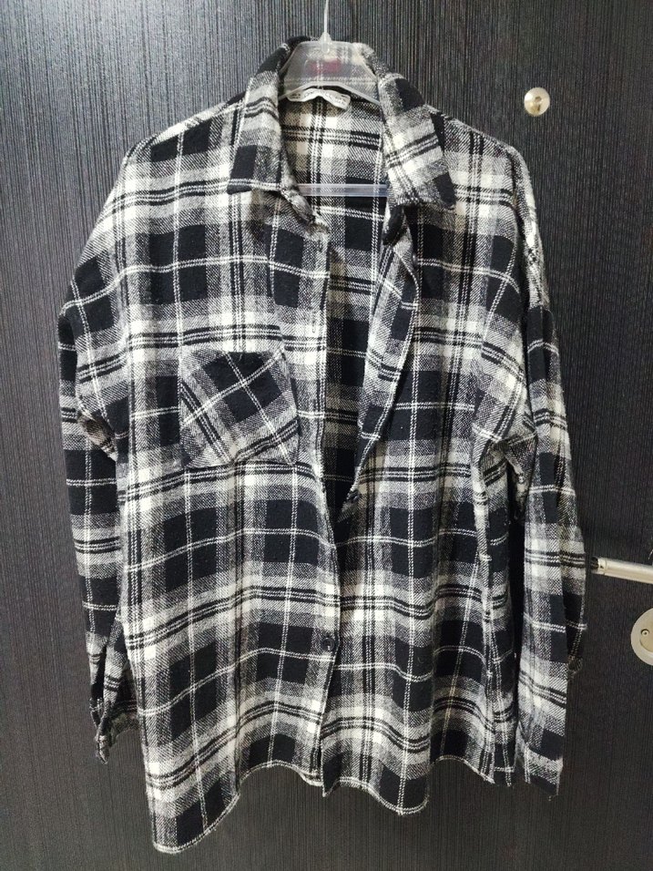 Gri kareli bu pamuklu gömlek, uzun kollu ve notched lapel yakalıdır. Düğmeli ve bol kesimdir, rahat sokak stiline uygundur. Günlük kullanım için idealdir.