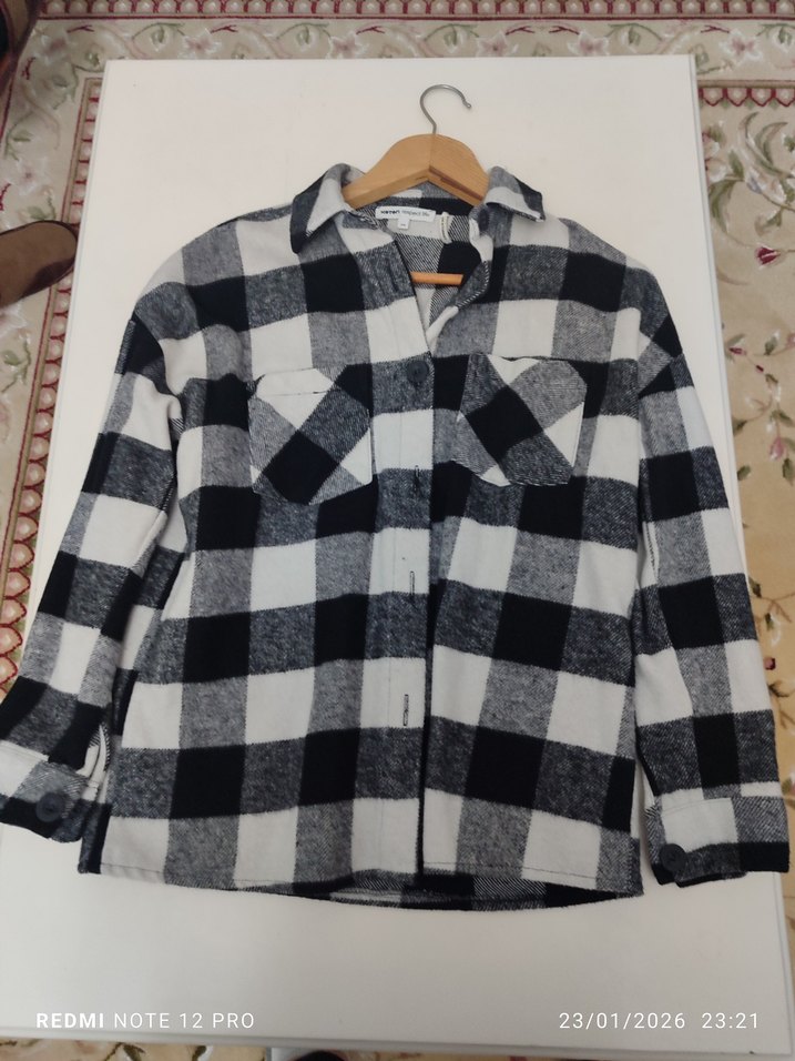 Gri kareli pamuklu gömlek, uzun kollu ve yakası açık. Salaş kesimi ve düğmeli manşetleriyle günlük kullanıma uygun rahat bir model.