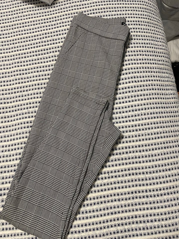 Gri kareli, pilili, normal boyda kadın kumaş pantolon. Sentetik kumaştan, iş ve sokak stiline uygun rahat kesim.