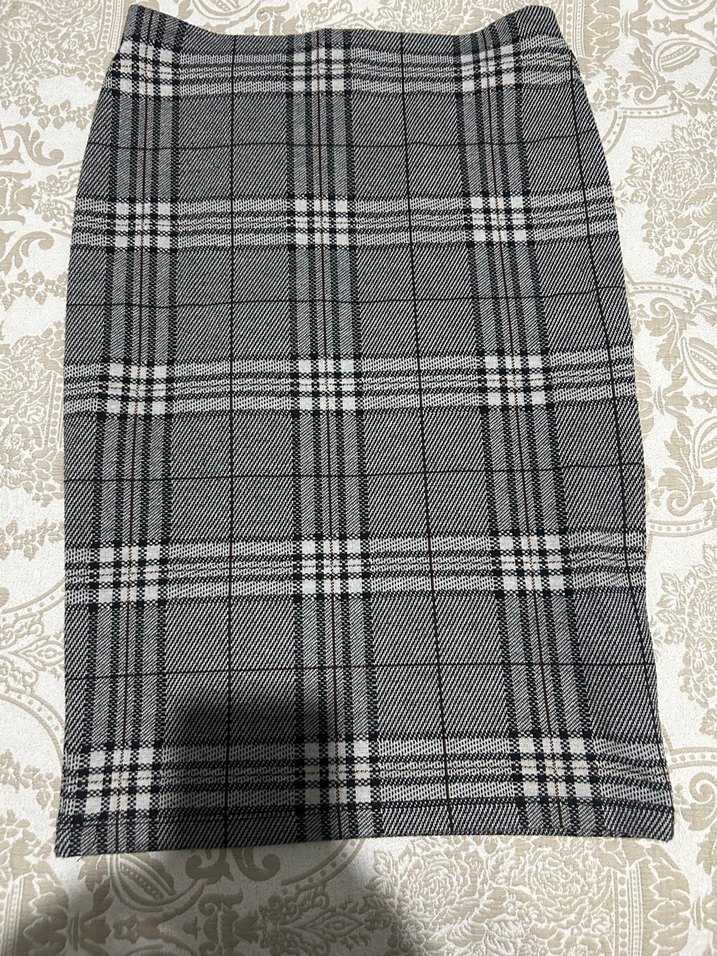 Gri kareli pilili midi kadın etek, yumuşak sentetik kumaştan, ofis kullanımı için uygun ve vücuda oturan kesimde.