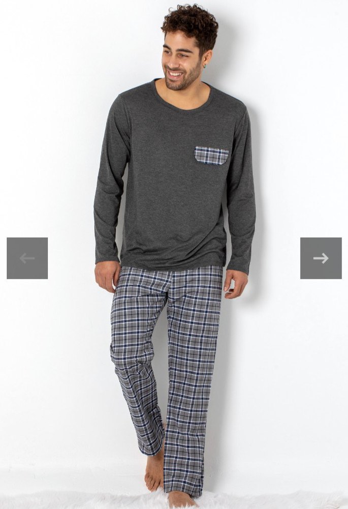 Uzun kollu, gri düz üst ve kareli midi boy pantolonlu, bol kesim erkek pijama takımı. Rahat ve şık tasarım sunar.