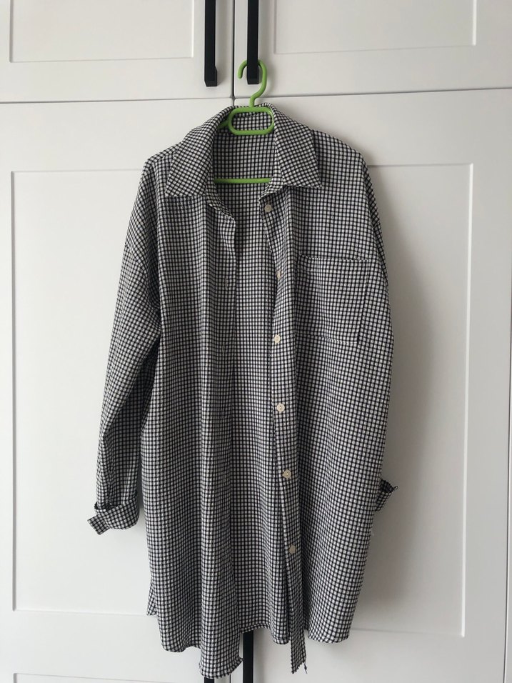 Gri kareli, keten kumaştan yapılmış, regular fit ve midi uzunlukta, uzun kollu, yaka detaylı kadın gömleği.