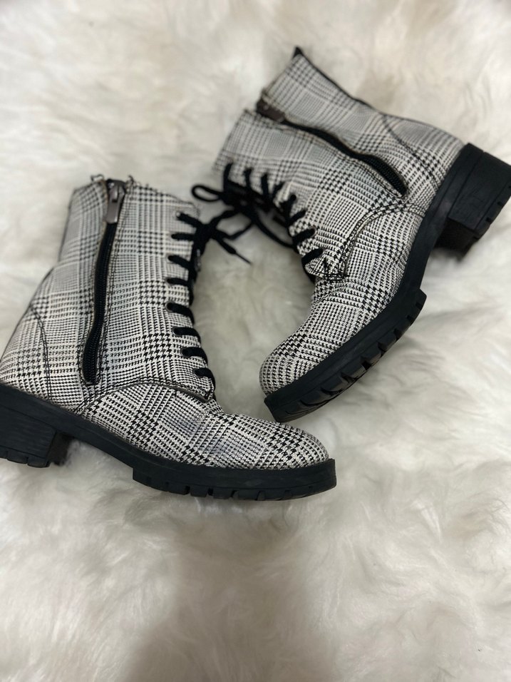 Gri kareli, tokalı kadın botları, blok topuklu ve kauçuk malzemelidir. Günlük sokak tarzı ve trend görünümler için uygundur.