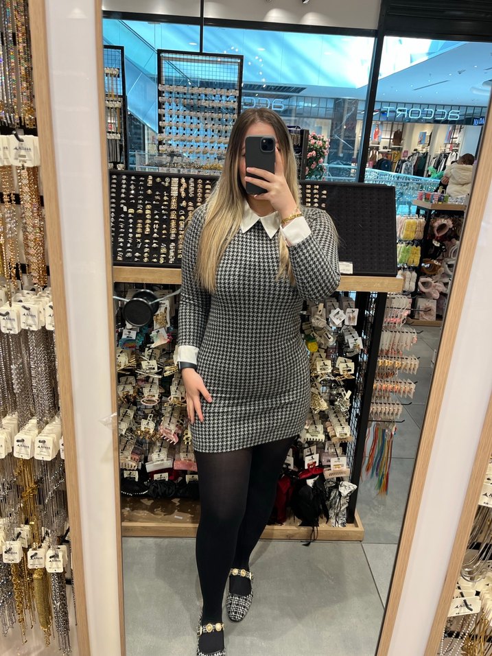Dar kesim, gri kareli desenli midi elbise, yakalı ve uzun kolludur. Yumuşak sentetik kumaştan üretilmiştir, günlük sokak modasına uygundur.