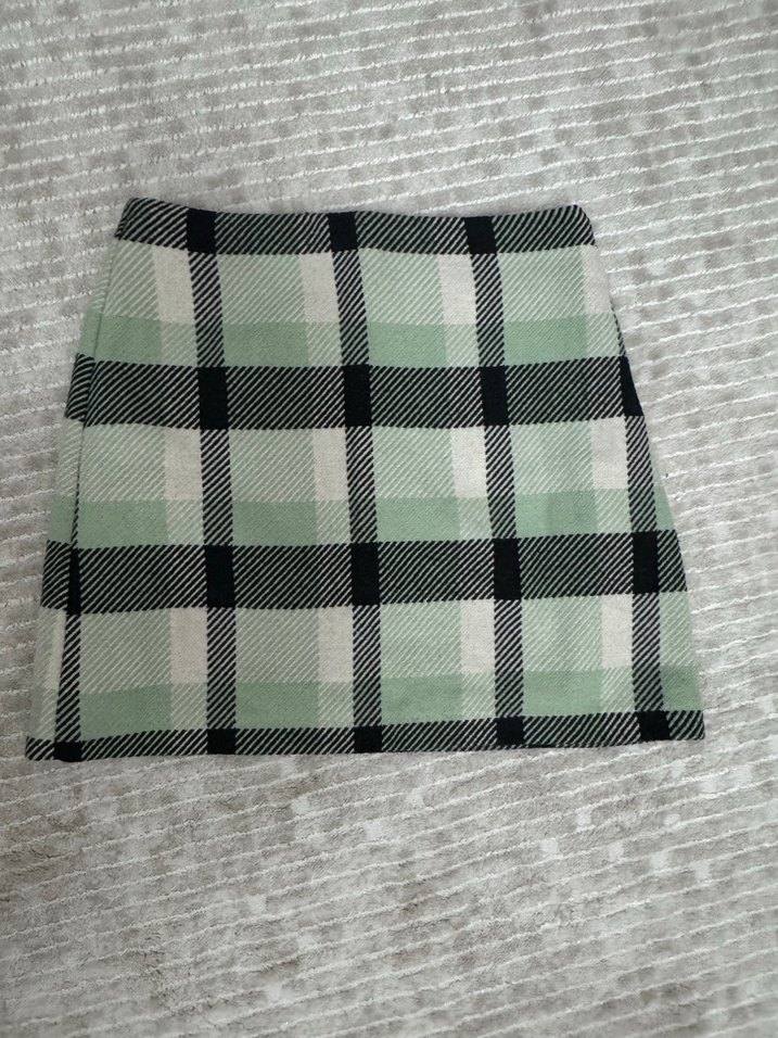 Gri kareli desene sahip, yumuşak triko kumaştan yapılmış, günlük kullanıma uygun, modern ve rahat kesim mini etek.