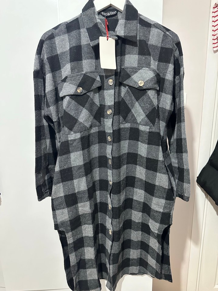 Gri kareli, düğmeli, uzun kollu ve bol kesim kadın gömlek. Notlu yaka detayıyla günlük rahat stil için uygundur. Boy 99 cm, koltuk altı eni 55 cm