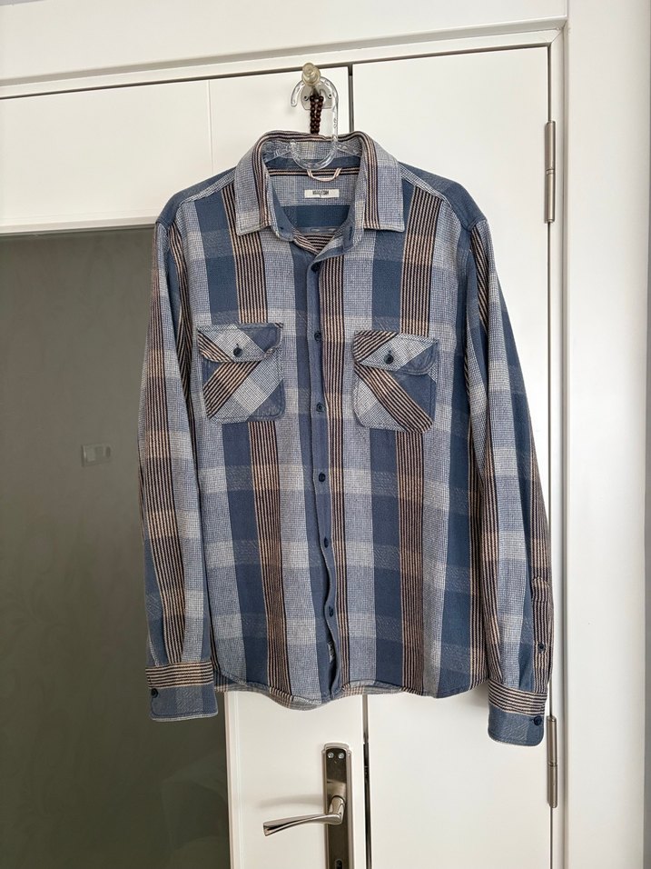 Gri kareli uzun kollu denim gömlek, yakalı ve düğmeli. Rahat kesimi ve günlük kullanıma uygun deseni ile casual tarzda.