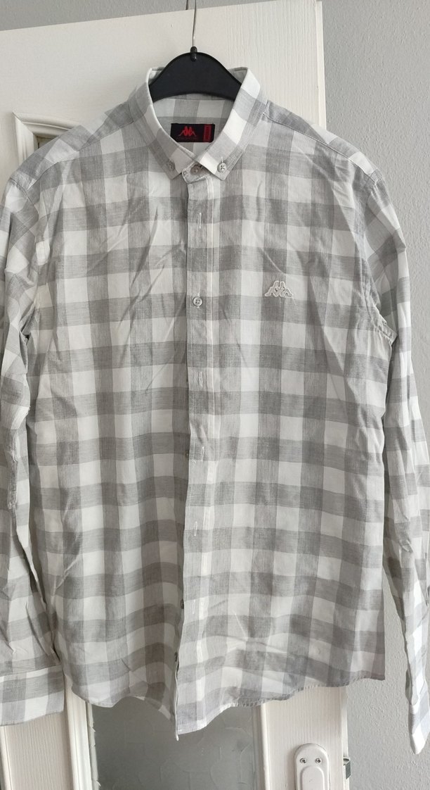Düğmeli, yakalı ve uzun kollu erkek keten gömlek. Gri kareli deseniyle rahat kesim ve günlük sokak stili için uygundur.
