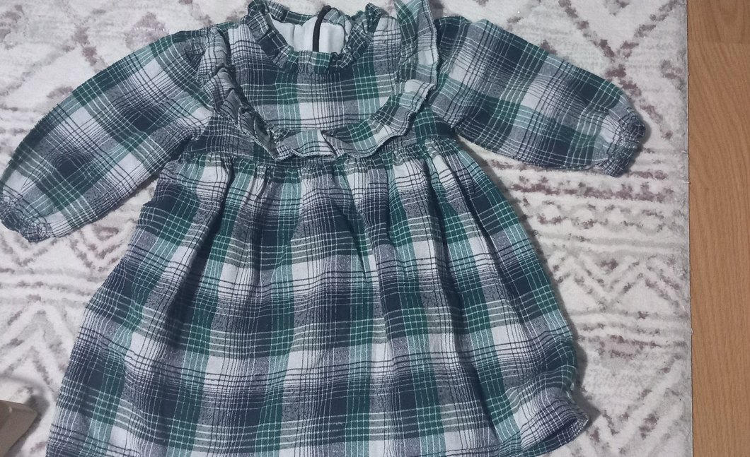 Gri kareli desenli, uzun kollu ve yakalı kız elbisesi. Fırfır detayları ve bol kesimiyle rahat bir tasarıma sahiptir.