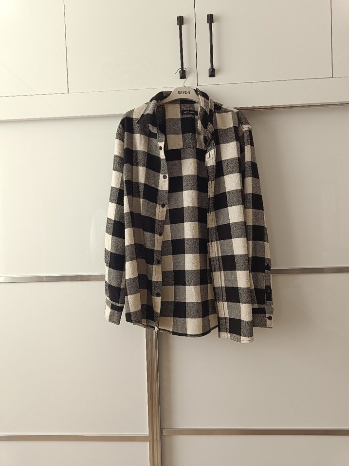 Gri kareli, düğmeli, uzun kollu, notlu yakalı, pamuklu kumaştan, rahat kesim gömleği, günlük sokak stili için uygun.