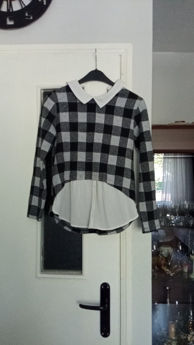 Gri kareli, uzun kollu, yakalı ve düğmeli kadın bluz. Rahat kesim ve beyaz kumaş detaylı katmanlı görünüm sunar, günlük sokak stili için uygundur.