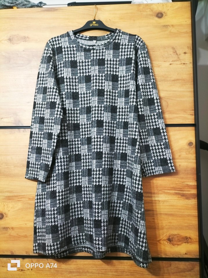 Gri kareli, uzun kollu ve bisiklet yaka kadın tunik. Yumuşak sentetik kumaştan örme detaylarla, rahat kesim ve günlük kullanıma uygun.
