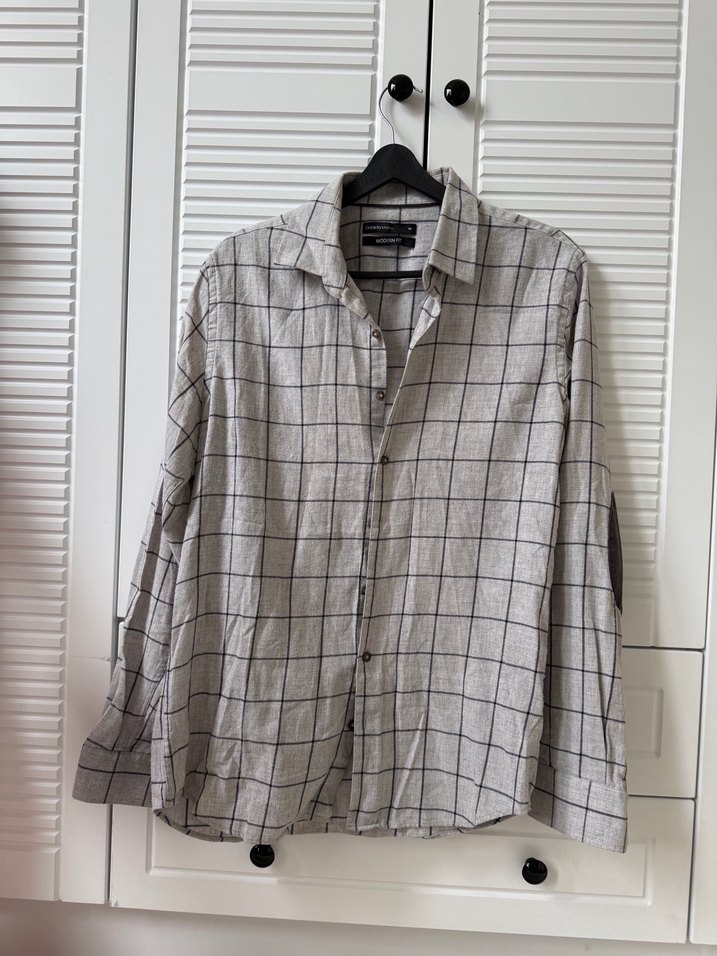 Gri keten gömlek, yakalı ve düğmeli ön detaylıdır. Uzun kollu ve bol kesimdir, günlük rahat sokak stili için uygundur. İnce kareli desene sahiptir.