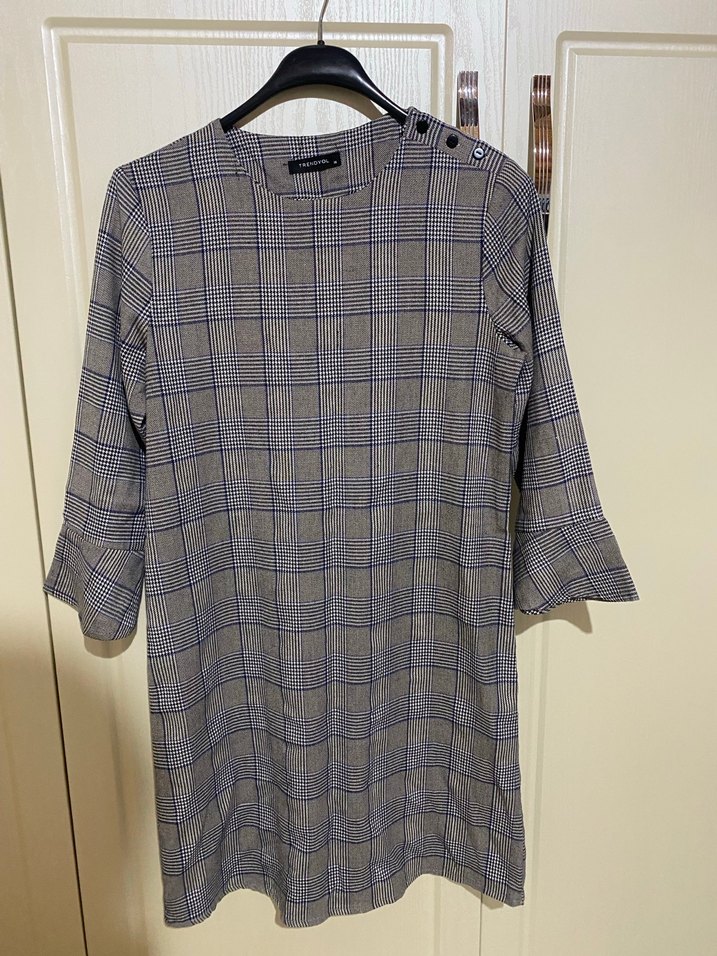 Gri kareli midi elbise, uzun kollu ve omuzda düğme detaylıdır.