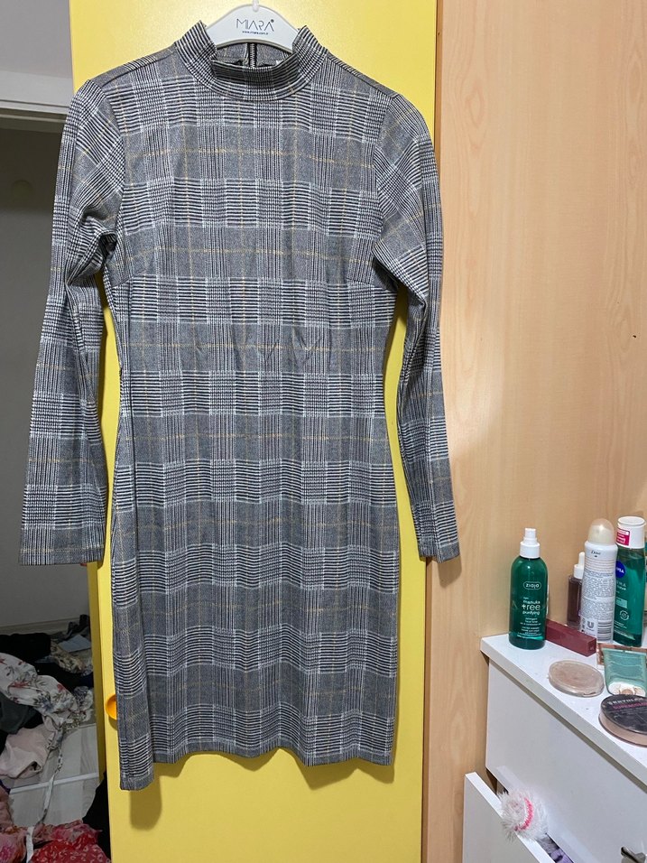 Gri kareli, uzun kollu, yüksek yaka ve kemerli, sentetik kumaştan yapılmış, vücuda oturan midi elbise. Günlük rahat sokak stili için uygundur.