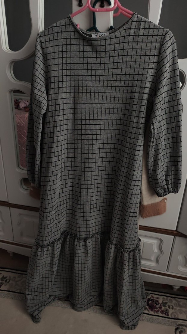 Gri kareli, uzun kollu, bol kesim midi elbise, fırfır detaylı, yuvarlak yaka, rahat sokak stili için uygun. 40 42 uyumlu sorunsuz mevsimlik çok incede değil çok kalinda değil