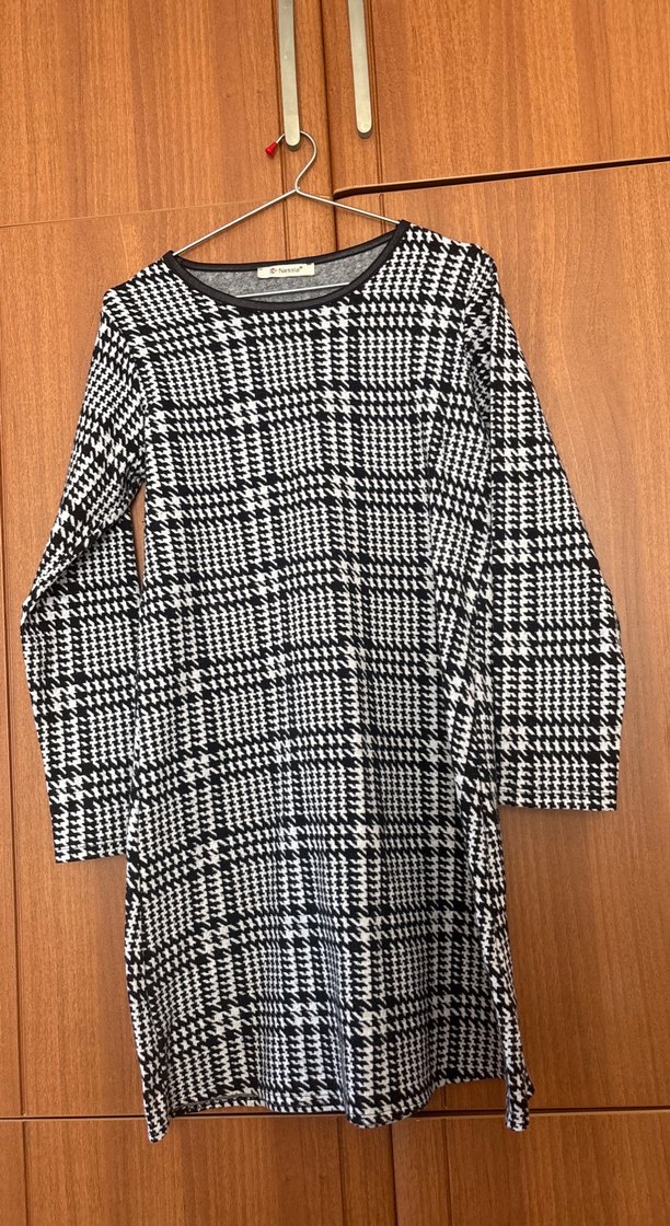 Gri kareli bu triko elbise uzun kollu ve bisiklet yaka olup, örme sentetik kumaştan yapılmıştır. Rahat kesimi ve midi boyuyla günlük sokak stiline uygundur. Omuzdan 90 cm