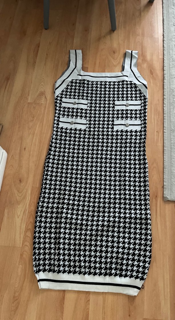 Gri kareli, kolsuz, uzun ve vücuda oturan örme elbise. Tekne yaka ve süs cepleri ile günlük rahat sokak stili için uygundur.