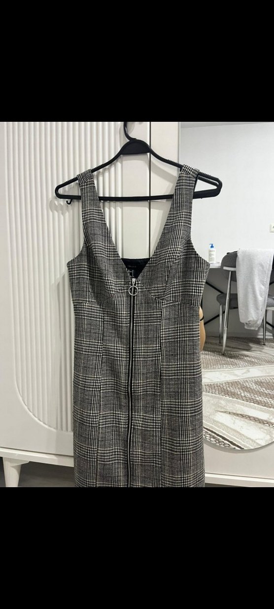 Gri kareli, fermuarlı ve V yakalı, kolsuz ve vücuda oturan midi elbise. Yumuşak sentetik kumaştan üretilmiştir, günlük sokak stili için uygundur.