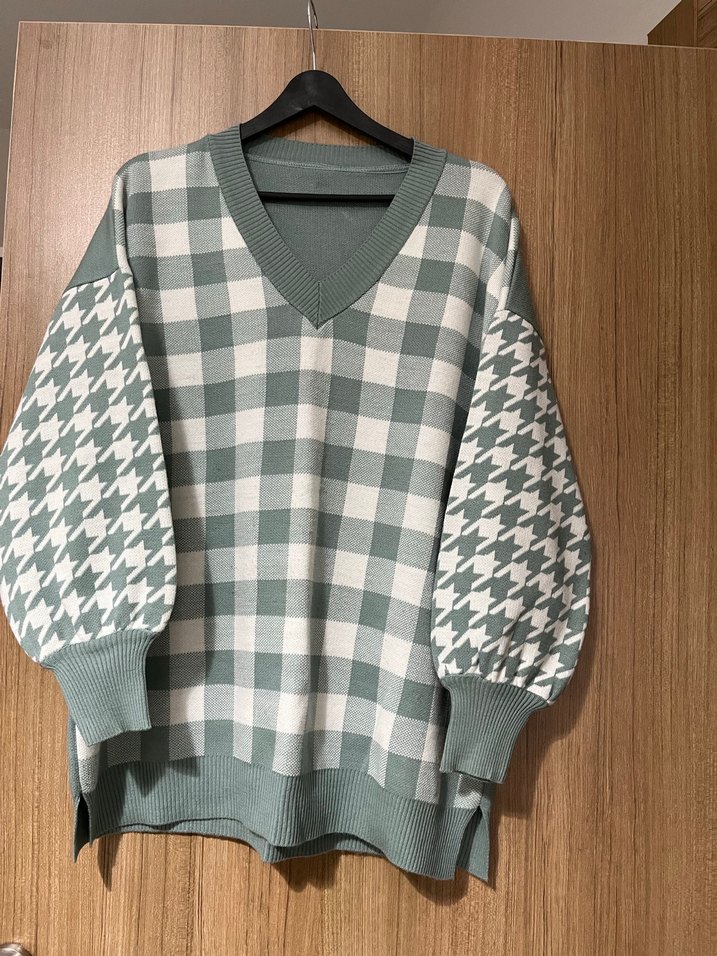 Gri kareli örgü kadın süveter, V yaka, uzun ve bol kollu, rahat kesimlidir. Günlük kullanıma uygundur. Melike tatar ürünü sorunsuz standart beden